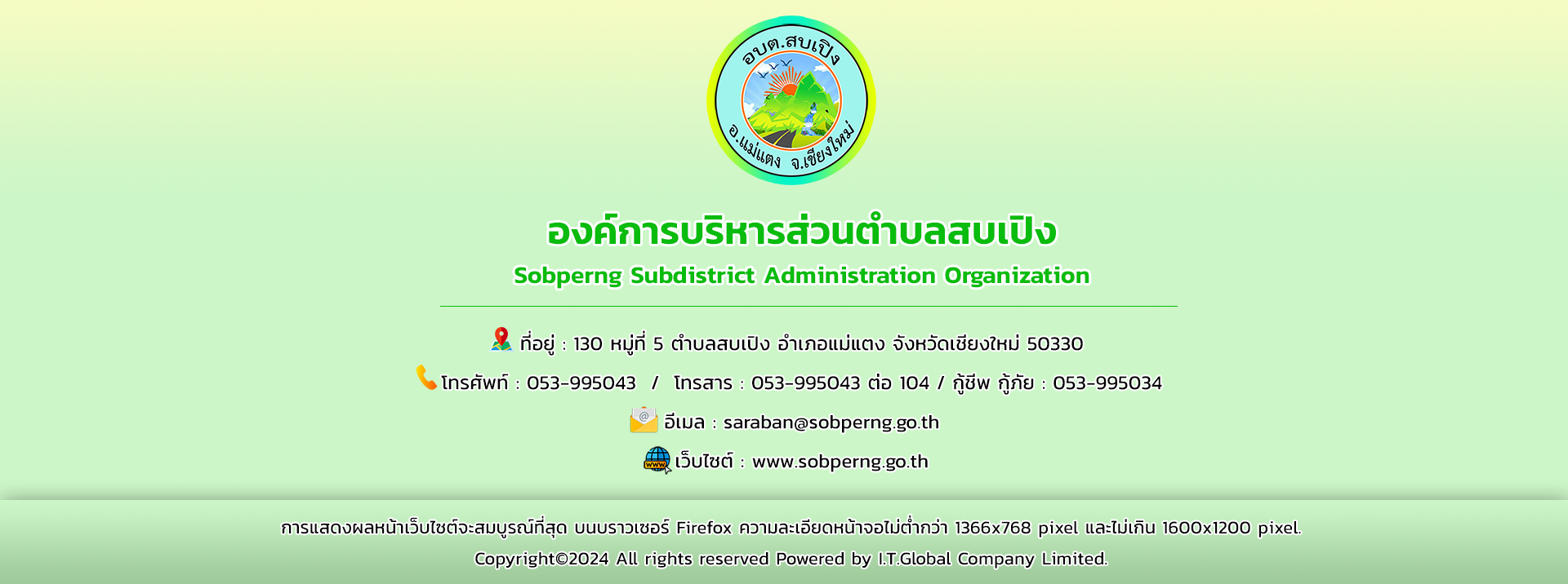 ยินดีต้อนรับเข้าสู่องค์การบริหารส่วนตำบลสบเปิง ติดต่อสอบถาม : โทรศัพท์ : 053-995043 อีเมล์ : saraban@sobperng.go.th โทรสาร (แฟกซ์) : 053-995043 ต่อ 104 กู้ชีพ กู้ภัย 053-995034
